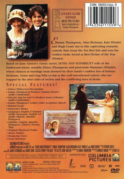Emma Thompson, Alan Rickman, Kate Winslet and Hugh Grant star in this captivating romantic comedy that swept the Ten Best Lists and was named the Best Picture of the Year by the Golden Globes. Based on Jane Austen's classic novel, SENSE AND SENSIBILITY tells of the Dashwood sisters, sensible Elinor (Thompson) and passionate Marianne (Winslet), whose chances at marriage seem doomed by their family's sudden loss of fortune. Rickman, Grant and Greg Wise co-star as the well-intentioned suitors who are trapped by the strict rules of society and the conflicting laws of desire. |