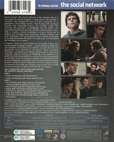 David Fincher's 'The Social Network' is the stunning tale of a new breed of cultural insurgent: a punk genius who sparked a revolution and changed the face of human interaction for a generation, and perhaps forever. Shot through with emotional brutality and unexpected humour, this superbly crafted film chronicles the formation of Facebook and the battles over ownership that followed upon the website's unfathomable success. With a complex, incisive screenplay by Aaron Sorkin and a brilliant cast including Jesse Eisenberg, Andrew Garfield and Justin Timberlake, 'The Social Network' bears witness to the birth of an idea that rewove the fabric of society even as it unravelled the friendship of its creators.-------------------------------------------------Le Réseau Social de David Fincher est l’incroyable histoire d’un nouveau genre d’agitateur culturel : un génie rebelle qui déclenchera une révolution et transformera les relations sociales de tout une génération, et ce, peut-être à tout jamais. Cette magnifique réalisation, contenant une violence émotionnelle et un humour inattendu, relate la création de Facebook et les batailles pour établir les droits de propriété qui suivirent le succès inimaginable du site Web. Grâce au scenario complexe et incisif d’Aaron Sorkin et à une distribution remarquable dont fait partie Jesse Eisenberg, Andrew Garfield et Justin Timberlake, Le Réseau Social consigne la naissance d’une idée qui changea le tissu social de la société tout en provoquant la rupture de l’amitié de ses créateurs.