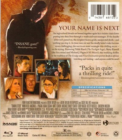 Six high school friends are bound together again by a sinister chain letter passing into their lives through e-mails and text messages. If the deadly letter isn’t passed on, the recipient faces a grisly, unexpected death – and nothing can stop it. As time runs out and the deadly letter’s rules become more challenging, the survivors must untangle the chilling secret – or die trying. Featuring Nikki Reed (The Twilight Saga), Betsy Russell (the Saw series), and Michael J. Pagan (CSI: Miami), this terrifying thriller in the tradition of The Grudge and Final Destination proves death is always watching and waiting – and anyone could be next! |