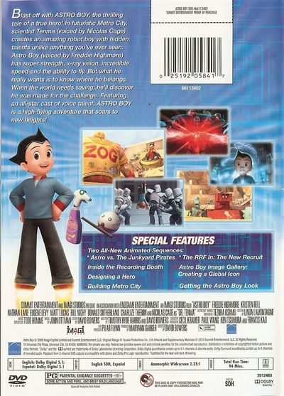 Blast off with Astro Boy, the thrilling tale of a true hero! In futuristic Metro City, scientist Tenma (voiced by Nicolas Cage) creates an amazing robot boy with hidden talents unlike anything you've ever seen. Astro Boy (voiced by Freddie Highmore) has super strength, x-ray vision, incredible speed and the ability to fly. But, what he really wants is to know where he belongs. When the world needs saving, he'll discover he was made for the challenge. Featuring an all-star cast of voice talent, it's high-flying adventure that soars to new heights! |