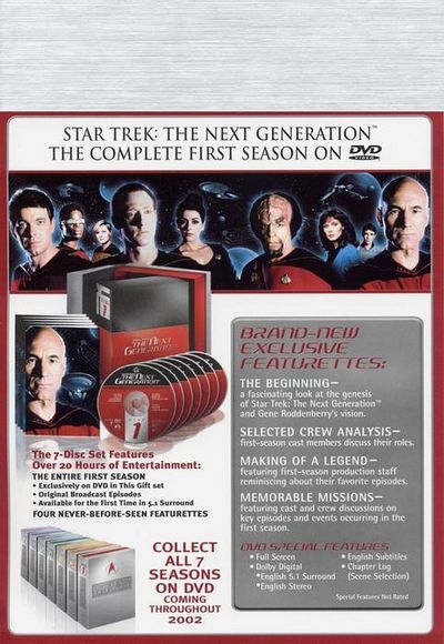 Disc 01 Chapter Log (Scene Selection)The Beginning - a fascinating look at the genesis of Star Trek: The Next Generation and Gene Roddenberry's vision.Selected Crew AnalysisMaking of a Legend - featuring first-season production staff reminiscing about their favorite episodes.Memorable Missions