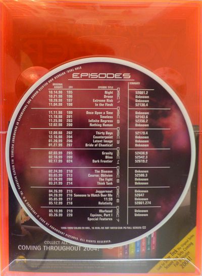 7-Disc set featuring over 20 hours of Entertainment.25 Original Broadcast Episodes, Available for the first time in 5.1 Surround.Disc 1OriginalAirdate EP# Episode Title Stardate10.14.98 195 Night 52081.210.21.98 196 Drone Unknown10.28.98 197 Extreme Risk Unknown11.04.98 198 In the Flesh 52136.4Disc 2OriginalAirdate EP# Episode Title Stardate11.11.98 199 Once Upon a Time Unknown11.18.98 201 Timeless 52143.611.25.98 203 Infinite Regress 52356.212.02.98 200 Nothin' Human UnknownDisc 3OriginalAirdate EP# Episode Title Stardate12.09.98 202 Thirty Days 52179.412.16.98 204 Counterpoint Unknown01.20.99 206 Latent Image Unknown01.27.99 207 Bride of Chaotica! UnknownDisc 4OriginalAirdate EP# Episode Title Stardate02.03.99 205 Gravity 52438.902.10.99 209 Bliss 52542.302.17.99 824 Dark Frontier, Part I 52619.2Disc 5OriginalAirdate EP# Episode Title Stardate02.24.99 210 The Disease Unknown03.03.99 213 Course: Oblivion 52586.303.24.99 208 The Fight Unknown03.31.99 214 Think Tank UnknownDisc 6OriginalAirdate EP# Episode Title Stardate04.26.99 215 Juggernaut Unknown04.28.99 216 Someone to Watch Over Me 5264705.05.99 217 11:59 Unknown05.12.99 218 Relativity 52861.274Disc 7OriginalAirdate EP# Episode Title Stardate 21805.19.99 219 Warhead Unknown05.26.99 220 Equinox Unknown |
