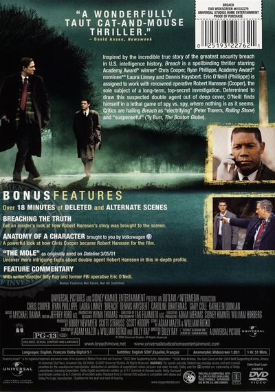 Inspired by the incredible true story of the greatest security breach in U.S. intelligence history, Breach is a spellbinding thriller starring Academy Award® winner* Chris Cooper, Ryan Phillippe, Academy Award® nominee** Laura Linney and Dennis Haysbert. Eric O'Neill (Phillippe) is assigned to work with renowned operative Robert Hanssen (Cooper), the sole subject of a long-term, top-secret investigation. Determined to draw this suspected double agent out of deep cover, O'Neill finds himself in a lethal game of spy vs. spy, where nothing is as it seems. Critics are hailing Breach as "electrifying" (Peter Travers, Rolling Stone) and "suspenseful" (Ty Burr, The Boston Globe).*2002 Best Supporting Actor, Adaptation.**2000 Best Actress, You Can Count on Me. 2004 Best Supporting Actress, Kinsey. |