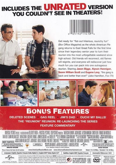 Get ready for "flat-out hilarious, raunchy fun" (Box Office Magazine) as the whole American Pie gang returns to East Great Falls for the first time since their legendary senior year to turn their union into the most unforgettable weekend since high school. Old friends will reconnect, old flames will reignite, and everyone will rediscover just how much fun you can pack into one outrageous reunion. Starring Jason Biggs, Alyson Hannigan, Seann William Scott and Eugene Levy, "the gang is back and better than ever!" (Jake Hamilton, Fox-TV) |