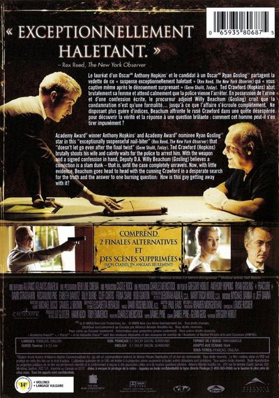 Academy Award winner Anthony Hopkins and Academy Award nominee Ryan Gosling are brilliant in this "exceptionally suspenseful nail-biter" (Rex Reed) that's so smart it "doesn't let go, even after the final twist" (Gene Shalit, Today). Ted Crawford (Hopkins) brutally murders his wife and calmly waits for the police to arrest him. With the weapon and a signed confession in hand, Deputy D.A., Willy Beachum (Gosling), believes a conviction is a slam dunk - that is until the case completely unravels. Now, with little evidence, Beachum goes head to head with the cunning Mr. Crawford in a desperate search for the truth and the answer to one burning question: How is this guy getting away with it?------------------------------------------------------------Le lauréat d’un Oscar Anthony Hopkins et le candidat à un Oscar Ryan Gosling partagent la vedette de ce « suspense exceptionnellement haletant » (Rex Reed, The New York Observer) qui « vous captive même après le dénouement surprenant » (Gene Shalit, Today). Ted Crawford (Hopkins) abat brutalement sa femme et attend calmement que la police vienne l’arrêter. En possession de l’arme et d’une confession écrite, le procureur adjoint Willy Beachum (Gosling) croit que la condamnation n’est qu’une formalité… jusqu'à ce que l’affaire s’écroule complètement. Ne disposant plus guère d’indices, Beachum affronte le rusé Crawford dans une quête désespérée pour découvrir la vérité et la réponse à une question brulante : comment cet homme peut-il s’en tirer impunément ?