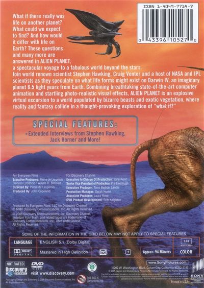 What if there really was life on another planet? What could we expect to find? And how would it differ with life on Earth? These questions and many more are answered in Alien Planet, a spectacular voyage to a fabulous world beyond the stars. Join world renown scientists Stephen Hawking, Craig Venter and a host of NASA and JPL scientists as they speculate on what life forms might exist on Darwin IV, an imaginary planet 6.5 light years from Earth. Combining breathtaking state-of-the-art computer animation and startling photo-realistic visual effects, Alien Planet is an explosive virtual excursion to a world populated by bizarre beasts and exotic vegetation, where reality and fantasy collide in a though-provoking exploration of "what if?"