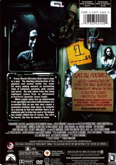 Trevor Reznik (Christian Bale) hasn't slept in a year. The shocking deterioration of his physical and mental health has made his every waking moment an unrelenting state of confusion, paranoia, guilt, anxiety and terror. His only solace from this living nightmare comes from an affectionate prostitute (Jennifer Jason Leigh).When cryptic notes turn up mysteriously in his apartment and when hallucinations of a co-worker that no one else sees causes a gruesome machine shop injury, he embarks on a journey to find out whether there is an elaborate plot to drive him mad or his fatigue has simply robbed him of reason. The more he learns, the less he wants to know. |