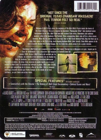"Not since the original Texas Chainsaw Massacre has terror felt so real." -Ken Fox, TV GuideWelcome to Wolf Creek, where the suspense of The Blair Witch Project meets the horror of The Texas Chainsaw Massacre. Inspired by Australia's "Backpacker Killer" who murdered seven backpackers in the '90s, Wolf Creek won wide acclaim from critics, filmmakers and audience members alike at the Sundance Film Festival. Three unsuspecting hikers take off for a drive across Australia. When the trio returns from a four hour hike to Wolf Creek National Park, they find their car is dead. Help comes in the form of big, back-slapping bushman Mick (John Jarratt). Since Mick appears to be more Crocodile Dundee than Freddy Krueger, the trio trusts him...which proves to be a grave mistake. Bienvenue à Wolf Creek, où le suspense de Le projet Blair rejoint l'horreur de Le Massacre à la scie. Inspiré par le « Tueur de randonneurs » qui a assassiné sept voyageurs en Australie dans les années 1990. Terreur à Wolf Creek a été acclamé par les critiques et les spectateurs lors du festival de films de Sundance. Trois randonneurs insouciants parcourent l'Australie en voiture. De retour d'une excursion de quatre heures dans le parc national de Wolf Creek, ils retrouvent leur véhicule en panne. Mick (John Jarratt), un grand gars sympathique de la brousse, offre de les aider. Celui ci évoquant davantage Crocodile Dundeee que Freddy Krueger, le trio décide de lui faire confiance...ce qui s'avère une erreur fatale.