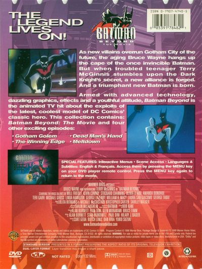Twenty years after Bruce Wayne's retirement as Batman, the world has changed even as he retreats from it, ceding control of his company, Wayne-Powers Enterprises, to his partner, Derek Powers. In that world, Terry McGinnis is an ordinary kid whose father, Warren, works for that company. While Terry was out on the town, he has a chance encounter with Bruce Wayne and, his legacy as Batman. He also learns that his father was murdered in his absence and finds a disc containing data that suggests the true motive for the crime and the culprit, Derek Powers. Turning to Wayne as the only one he can trust, he learns that Wayne will not help him directly fight Powers. In desperation and without permission, Terry dons Wayne's last Batman outfit to challenge Powers himsef, but can he convince Wayne to help him in order to fight Derek Powers?This collection contains: Batman Beyond: The Movie and four other exciting episodes:Gotham GolemDead Man's HandThe Winning EdgeMeltdown |