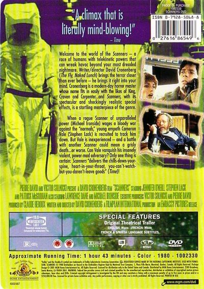 Welcome to the world of the Scanners – a race of humans with telekinetic powers that can wreak havoc beyond your most dreaded nightmare. Writer/director David Cronenberg (The Fly, Naked Lunch) brings the terror closer than ever before – he brings it right into your mind. Cronenberg is a modern-day horror master whose name fits easily with the likes of King, Craven and Carpenter...and Scanners, with its spectacular and shockingly realistic special effects, is a startling masterpiece of the genre. When a rogue Scanner of unparalleled power (Michael Ironside) wages a bloody war against the "normals," young empath Cameron Vale (Stephen Lack) is recruited to track him down. But Vale is inexperienced – and a battle with another Scanner could mean a grisly death...or worse. Can Vale vanquish his insanely violent, power-mad adversary? Only one thing is certain: Scanners "delivers chills-down-your-spine, heart-in-your-throat, you-can't-watch-but-you-daren't-leave goods" (Time)! |