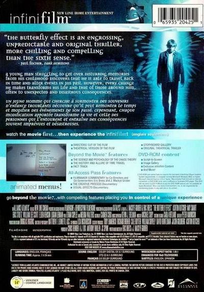 A young man struggling to get over disturbing memories from his childhood discovers that he is able to travel back in time and alter events in his past. However, every change he makes transforms his life and that of those around him, often to unexpected and disastrous consequences. Un jeune homme qui cherche à surmonter des souvenirs d'enfance troublants découvre qu'il peut remonter le temps et modifier des événements de son passé. Cependant, chaque modification apportée transforme sa vie et celle des personnes qui l'entourent et entraîne des conséquences imprévues et désastreuses. |