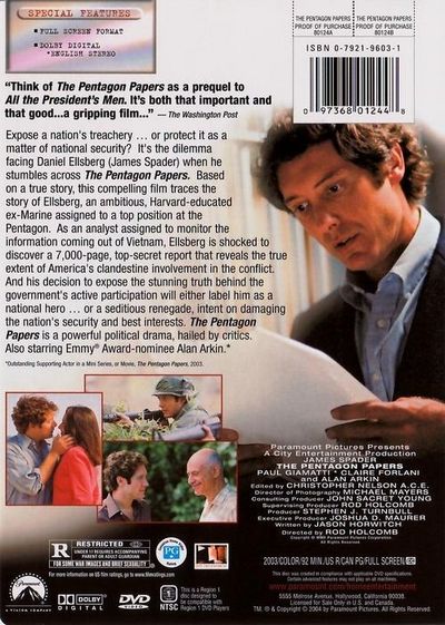 Expose a nation's treachery...or protect it as a matter of national security? It's the dilemma facing Daniel Ellsberg (James Spader) when he stumbles across "The Pentagon Papers." Based on a true story, this compelling film traces the story of Ellsberg, an ambitious, Harvard-educated ex-Marine assigned to the top position at the Pentagon. As an analyst assigned to monitor the information coming out of Vietnam, Ellsberg is shocked to discover a 7,000-page, top-secret report that reveals the true extent of America's clandestine involvement in the conflict. And his decision to expose the stunning truth behind the government's active participation will either label him as national hero...or a seditious renegade, intent on damaging the nation's security and best interests. "The Pentagon Papers" is a powerful political drama, hailed by critics. Also starring Emmy Award-nominee Alan Arkin. |