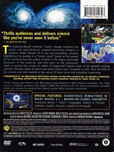 Explore theiUniverse from its tiniest particleito its greatest expanse.The Academy Award® nominee Cosmic Voyage combines live action with state-f-the-art computer-generated imagery to pinpoint where humans fit in our ever-expanding universe. Highlighting this journey is a "cosmic zoom" based on the powers of 10, extending from the Earth to the largest observable structures in the universe, and then back to the subnuclear realm- a guided tour across 42 orders of magnitude! Explore some of the greatest existing scientific theories, some of which have never before been visualized on film, from the birth of the cosmos and solar system to the nature of black holes and exploding supernovas.Cosmic Voyage was filmed in the IMAX format and exhibited in IMAX theaters worldwide. This video version is digitally mastered from original 70MM film elements with the sound components specially mixed and mastered to produce the highest quality Dolby Surround Soundtrack.Narrated by Morgan Freeman