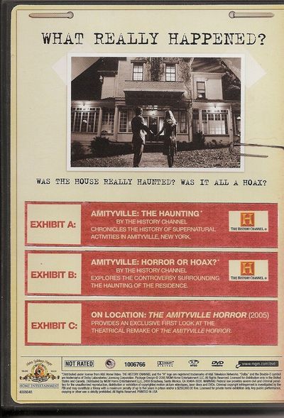 EXHIBIT A: AMITYVILLE: THE HAUNTING - BY THE HISTORY CHANNEL CHRONICLES THE HISTORY OF SUPERNATURAL ACTIVITIES IN AMITYVILLE NEW YORK.EXHIBIT B: AMITYVILLE: HORROR OR HOAX? BY THE HISTORY CHANNEL EXPLORES THE CONTROVERSY SURROUNDING THE HAUNTING OF THE RESIDENCE.EXHIBIT C: ON LOCATION: THE AMITYVILLE HORROR (2005) PROVIDES AN EXCLUSIVE LOOK AT THE THEATRICAL REMAKE OF THE AMITYVILLE HORROR. |