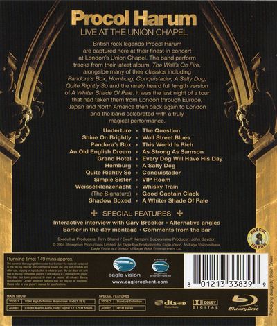 British rock legends Procol Harum are captured here at their finest in concert at London's Union Chapel. The band preform tracks from their latest album, The Well's On Fire, alongside many of their classics including Pandora's Box, Homburg, Conquistador, A Salty Dog, Quite Rightly So and the rarely heard full length version of A Whiter Shade Of Pale. It was the last night of a tour that had taken them from London through Europe, Japan and North America then back again to London and the band celebrated with a truly magical performance. Underture • The Question Shine On Brightly • Wall Street Blues Pandora's Box • This World Is Rich An Old English Dream • As Strong As Samson Grand Hotel • Every Dog Will Have His Day Homburg • A Salty Dog Quite Rightly So • Conquistador Simple Sister • VIP Room Weisselklenzenacht • Whisky Train (The Signature) • Good Captain Clack Shadow Boxed • A Whiter Shade Of Pale