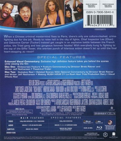 When a Chinese criminal mastermind flees to Paris, there's only one culture-clashed, crime-fighting duo for the job. Ready to raise hell in the city of lights, Chief Inspector Lee (Chan) and Detective Carter (Tucker) instead get caught in an explosive battle between the French police, the Triad gang and two gorgeous femmes fatales! With everybody kung fu fighting to the top of the Eiffel Tower, this one-two punch of hilarious action doesn't let up until the final heart-stopping au revoir! |