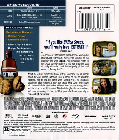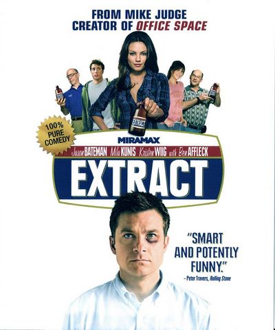 The creator of Office Space, writer-director Mike Judge (Beavis and Butt-Head), moves from cubicles to the assembly line with Extract. His outrageous return to workplace comedy features a hilarious ensemble cast of quirky characters. About to sell his successful flavor extract company, life is almost sweet for Joel (Jason Bateman) until a freak on-the-job accident happens. Add to that his bored wife (Kristen Wiig), his laid-back best friend (Ben Affleck), a sexy con artist (Mila Kunis) who blows into town with dollar signs in her bedroom eyes, and a dumb gigolo- and life as he knows it turns sour. Filled with laugh-out-loud one-liners and raunchy comedy, Extract is 100% pure hilarity. |
