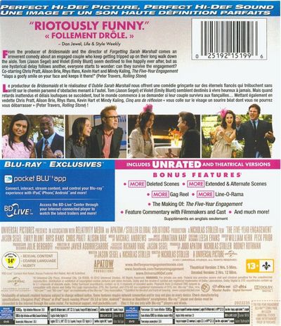 From the producer of Bridesmaids and the director of Forgetting Sarah Marshall comes an irreverent comedy about an engaged couple who keep getting tripped up on their long walk down the aisle. Tom (Jason Segel) and Violet (Emily Blunt) seem destined to live happily ever after, but as one hysterical delay follows another, everyone starts to wonder: can they survive the engagement? Co-starring Chris Pratt, Alison Brie, Rhys Ifans, Kevin Hart and Mindy Kaling, The Five-Year Engagement "slaps a goofy smile on your face and keeps it there!" (Peter Travers, Rolling Stone) |