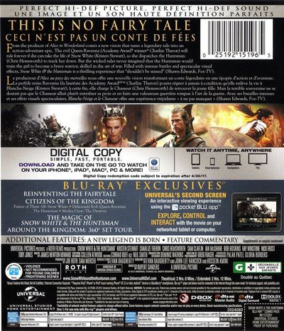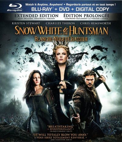 From the producer of Alice in Wonderland comes a new vision that turns a legendary tale into an action-adventure epic. The evil Queen Ravenna (Academy Award® winner Charlize Theron) will rule forever if she can take the life of Snow White (Kristen Stewart), so she dispatches the Huntsman (Chris Hemsworth) to track her down. But the wicked ruler never imagined that the Huntsman would train the girl to become a brave warrior, skilled in the art of war. Filled with intense battles and spectacular visual effects, Snow White & the Huntsman is a thrilling experience that "shouldn't be missed" (Shawn Edwards, Fox-TV).Le producteur d'Alice au pays des merveilles nous offre une nouvelle vision transformant un conte légendaire en une épopée d'action et d'aventure. La perfide reine Ravenna (la lauréate des Academy Award Charlize Theron) pourra régner à jamais à condition qu'elle enlève la vie à Blanche-Neige (Kristen Stewart); à cette fin, elle charge le Chasseur (Chris Hemsworth) de retrouver la jeune fille. Mais la terrible souveraine ne se doutait pas que le Chasseur allait plutôt entraîner sa proie et en faire une valeureuse guerrière rompue à l'art de la guerre. Avec ses batailles intenses et ses effets visuels spectaculaires, Blanche-Neige et le Chasseur offre une expérience trépidante « à ne pas manquer » (Shawn Edwards, Fox-TV).