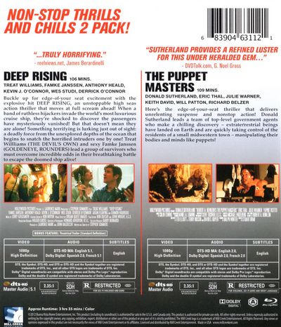 Deep Rising: Buckle up for edge-of-your seat excitement with the explosive hit DEEP RISING, an unstoppable high seas action thriller that moves at full scream ahead! When a band of ruthless hijackers invade the world's most luxurious cruise ship, they're shocked to discover the passengers have mysteriously vanished! But that doesn't mean they are alone! Something terrifying is lurking just out of sight: a deadly force from the unexplored depths of the ocean that begins to snatch the horrified intruders one by one! Treat Willliams (THE DEVIL'S OWN) and sexy Famke Janssen (GOLDENEYE, ROUNDERS) lead a group of survivors who must overcome incredible odds in their breathtaking battle to escape the doomed ship alive! The Puppet Masters: Here's the edge-of-your-seat thriller that delivers unrelenting suspense and nonstop action! Donald Sutherland leads a team of top-level government agents who make a chilling discovery extraterrestrial beings have landed on Earth and are quickly taking control of the residents of a small midwestern town manipulating their bodies and minds like puppets! |