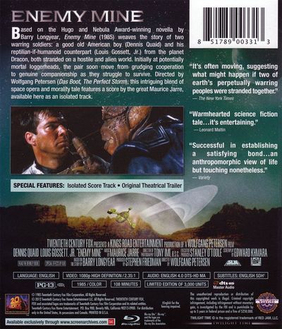 Based on the Hugo and Nebula Award-winning novella by Barry Longyear, Enemy Mine (1985) weaves the story of two warring soldiers: a good old American boy (Dennis Quaid) and his reptilian-if-humanoid counterpart (Louis Gossett, Jr.) from the planer Dracon, both stranded on a hostile alien world. Initially at potentially mortal loggerheads, the pair soon move from grudging cooperation to genuine companionship as they struggle to survive. Directed by Wolfgang Peterson (Das Boot, The Perfect Storm), this intriguing blend of space opera and morality tale features a score by the great Maurice Jarre, available here as an isolated track. |