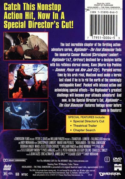 Chosen centuries ago to protect all that is good... Now, an evil enemy has journeyed through time to destroy him!The last incredible chapter of the thrilling action-adventure series, Highlander - The Final Dimension finds the immortal Connor MacLeod (Christopher Lambert - Highlander 1&2, Fortress) destined for a decisive battle with his ruthless eternal enemy, Kane (Mario Van Peebles - Gunmen, Posse and New Jack City). Pursued across time by his arch rival, MacLeod must make a heroic last stand if he is to rid the earth of the seemingly unstoppable Kane! Packed with intense action and astonishing special effects - the Highlander's greatest challenge will become your ultimate adventure! And now, in the Special Director's Cut, Highlander - The Final Dimension features footage never before seen in theaters! |