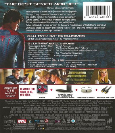 Teenage social outcast Peter (Andrew Garfield) spends his days trying to unravel the mystery of his own past and win the heart of his high school crush, Gwen Stacy (Emma Stone). A mysterious briefcase belonging to his father, who abandoned him when he was a child, leads Peter to his dad's former partner, Dr. Connors. The discovery of his father's secret will ultimately shape his destiny of becoming "Spider-Man" and bring him face to face with Connors' villainous alter ego, the Lizard. |