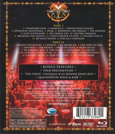 Operation Mindcrime Part I 1. I Remember Now 2. Anarchy-X 3. Revolution Calling 4. Operation: Mindcrime 5. Speak 6. Spreading The Disease 7. The Mission 8. Suite Sister Mary 9. The Needle Lies 10. Electric Requiem 11. Breaking The Silence 12. I Don’t Believe In Love 13. Waiting For 22 14. My Empty Room 15. Eyes Of A Stranger Operation Mindcrime Part II 16. Freiheit Ouverture 17. Convict 18. I’m American 19. One Foot In Hell 20. Hostage 21. The Hands 22. Speed Of Light 23. Signs Say Go 24. Re-Arrange You 25. The Chase 26. Murderer? 27. Circles 28. If I Could Change It All 29. An Intentional Confrontation 30. A Junkie’s Blues 31. Fear City Slide 32. All The Promises Encore 33. Walk In The Shadows 34. Jet City Woman Tracklist Part I 1 I Remember Now 1:22 2 Anarchy-X 1:39 3 Revolution Calling 5:05 4 Operation: Mindcrime 4:32 5 Speak 3:53 6 Spreading 4:12 7 The Mission 6:10 8 Suite Sister Mary 9:53 9 The Needle Lies 3:01 10 Electric Requiem 3:44 11 Breaking The Silence 4:27 12 I Don't Believe In Love 5:58 13 Waiting For 22 1:25 14 My Empty Room 3:28 15 Eyes Of A Stranger 6:00 Part II 16 Freiheit Ouvertüre 1:20 17 Convict 0:08 18 I'm American 2:51 19 One Foot In Hell 4:11 20 Hostage 4:20 21 The Hands 4:31 22 Speed Of Light 3:09 23 Signs Say Go 3:16 24 Re-Arrange You 3:10 25 The Chase 3:06 26 Murderer? 4:33 27 Circles 3:00 28 If I Could Change It All 4:27 29 An Intentional Confrontation 2:32 30 A Junkie's Blues 3:34 31 Fear City Slide 4:49 32 All The Promises 5:15 Encore 33 Walk In The Shadows 4:53 34 Jet City Woman 5:49 Bonus Features 35 Tour Documentary 36 The Chase Performer – Ronnie James Dio 37 Queensrÿche Rock And Ride |