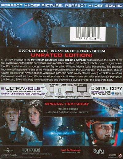 Battlestar: Blood & Chrome, which takes place in the 10th year of the first Cylon war. As the battle between humans and their creation, a sentient robotic race, rages across the 12 colonial worlds, a brash rookie viper pilot enters the fray. Ensign William Adama (Pasqualino), barely in his 20's and a recent Academy graduate, finds himself assigned to one of the most powerful ships in the Colonial fleet...the Galactica. The talented but hot-headed risk-taker soon finds himself leading a dangerous top secret mission that, if successful, will turn the tide of the decade-long war in favor of the desperate fleet. |