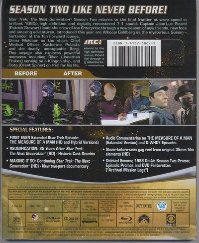 Disc 01 Episodic Promos 1988 On-Air Season Two Promo Energized! Season Two Tech Update (HD) 1988 Reading Rainbow segment with LeVar Burton 2012 Reading Rainbow iTunes Promo (HD) Archival Mission Log: Departmental Briefing Year Two: Production Episodic Promos The Measure of a Man (HD Extended Version) Audio Commentary by Melinda Snodgrass and Mike & Denise Okuda The Measure of a Man (Hybrid Extended Version) The Icarus Factor Deleted Scene Episoodic Promos Gag Reel (HD) Archival Mission Log: Inside Starfleet Archives: Penny Juday - Star Trek Coordinator Archival Mission Log: Selected Crew Analysis Year Two Q Who? Audio Commentary by Dan Curry, Rob Bowman and Mike & Denise Okuda Up The Long Ladder Deleted Scenes Episodic Promos Archival Mission Log: Departmental Analysis Year Two: Memorable Missions Episodic Promos REUNIFICATION: 25 Years After Star Trek: The Next Generation (HD) MAKING IT SO: Continuing Star Trek: The Next Generation (HD) Part 1: Strange New Worlds Part 2: New Life and New Civilizations Archival Mission Log: Mission Overview Year Two