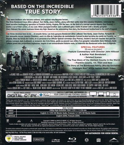 Audio Commentary: Director John Hillcoat and Author Matt Bondurant offer a good commentary that nicely intermixes the worlds of truth and fiction which intersect in both the novel and the film. They cover the historical period, plot basics and intricacies both, character development and performances, the dichotomy between city and rural life and their intersection in the story, production design and cinematography, and much more. This is a very well balanced track that fans will want to absorb. Deleted Scenes (HD, 7:58): 6 Legged Cow, Forrest and Tizwell, Campfire (Alternate), Howard Tells Forrest that Jack Stole the Moonshine, Rakes and Feather, and Jr. with Brass Knuckles. Lawless: The True Story of the Wettest County in the World (HD, 21:33): Cast and crew offer a detailed historical overview of the period and characters depicted in the film. Included are authentic photographs and clips from the film. Franklin County, Virginia: Then & Now (HD, 6:11): A short but fascinating glimpse into the county's history and current state. The Story of the Bondurant Family (HD, 12:44): Author Matt Bondurant offers some insight into his family's background and his process for crafting the novel. Music Video (HD, 1:39): "Midnight Run" by Willie Nelson. |