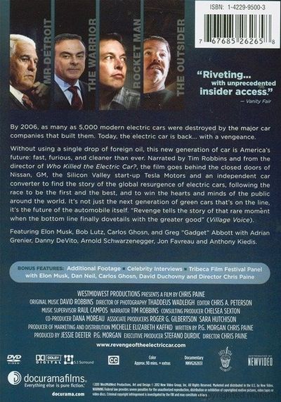 Revenge of the Electric Car presents the recent resurgence of electric vehicles as seen through the eyes of four pioneers of the EV revolution. Director Chris Paine (Who Killed the Electric Car? 2006) has had unprecedented access to the electric car research and development programs at General Motors, Nissan, and Tesla Motors, while also following a part time electric car converter who refuses to wait for the international car makers to create the electric cars the public demands. As more models of electric cars than ever before start to arrive in showrooms and driveways across the world, Chris Paine's film offers an inspiring, entertaining and definitive account of this revolutionary moment in human transportation. Revenge of the Electric Car follows these auto makers as they race each other to create the first, best, and most publicly accepted electric cars for the new car market. Written by Michelle Kaffko es.